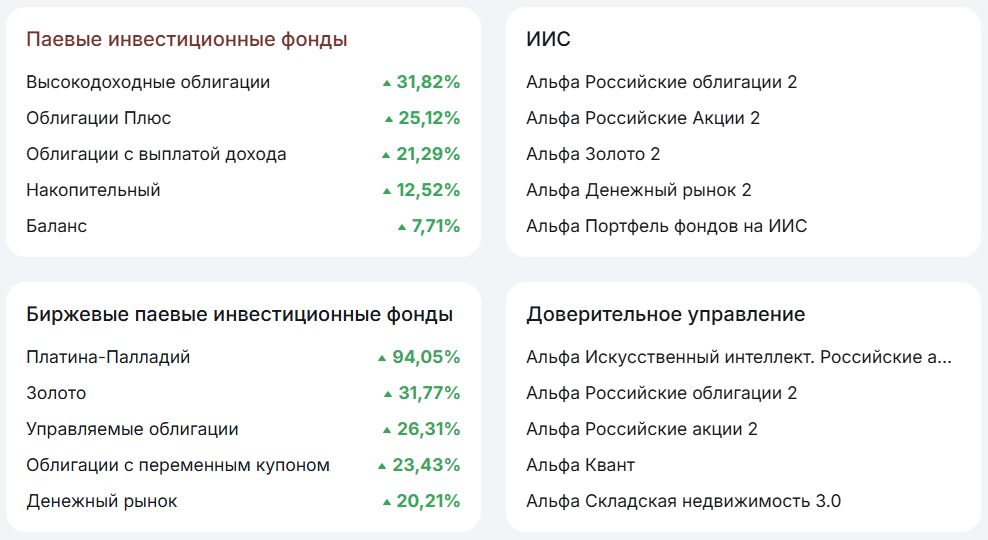 УК «Альфа-Капитал» занимает весомую нишу в сегменте доверительного управления капиталом состоятельных клиентов. Однако она предлагает инвесторам и другие инструменты — например, покупку паев паевых инвестиционных фондов, в состав имущества которых заводятся акции, облигации, драгметаллы, недвижимость и др.