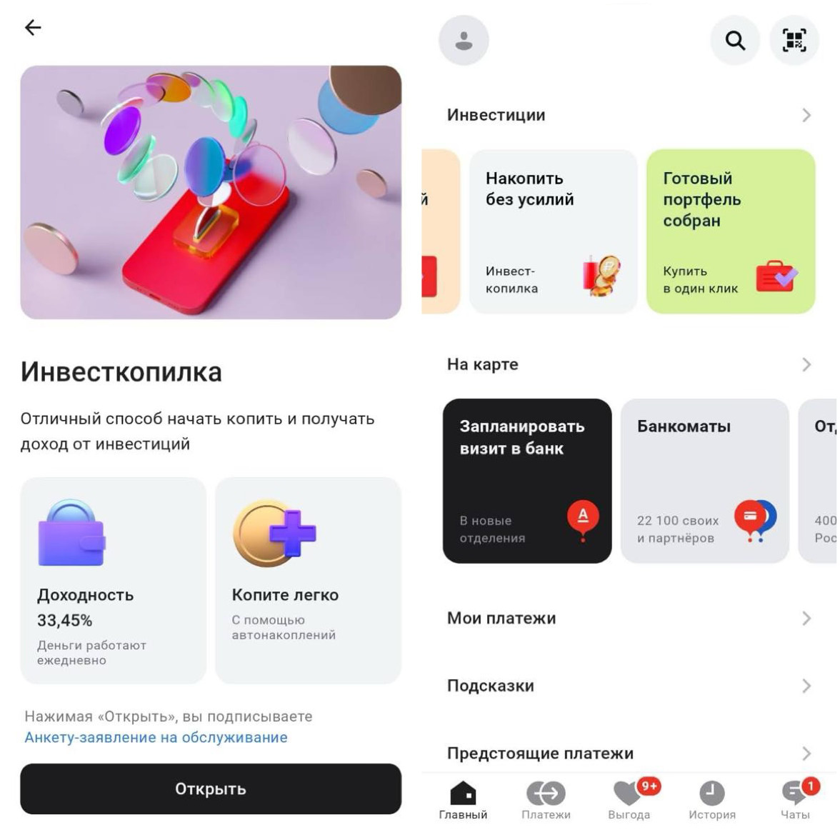 Начать работу с инвесткопилкой можно в приложении Альфа-банка — найдите раздел «Инвестиции» на главной странице.